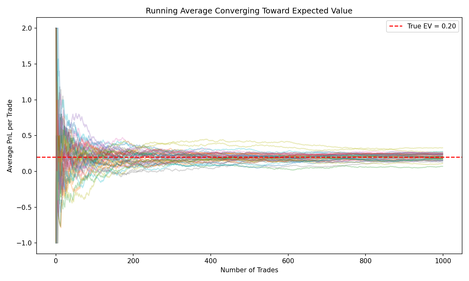 Early on, the running average jumps around violently. As the number of trades grows, it slowly stabilizes near the true EV.
